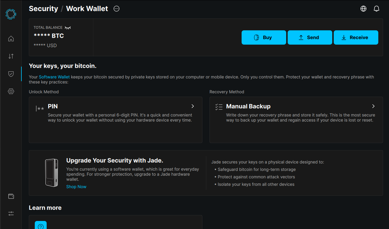 The Blockstream app is a software wallet by default, giving you immediate access to self-custody. When you're ready to upgrade to hardware security, Jade integration is seamless.