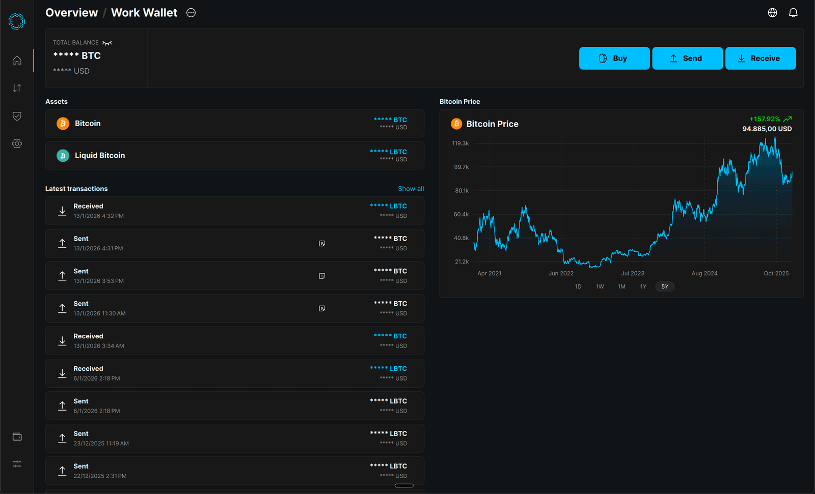 We reimagined the home dashboard UI, giving you a bird’s eye view of all your accounts and assets on one clean interface. See your bitcoin and Liquid assets side by side, with real-time price information and recent transaction history at a glance.