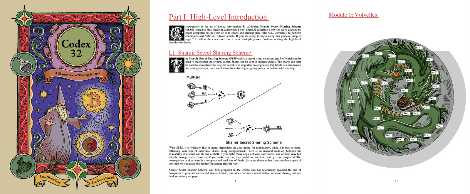 Today, we are launching Codex32: A Shamir Secret Sharing Scheme, a new booklet available on the Blockstream store. Codex32 contains tear-out worksheets for checksumming and secret sharing, paper computers that can be cut out and assembled, a worksheet for removing bias from dice rolls, and beautiful artwork by Micaela Paez and M. Lufti' As'ad.