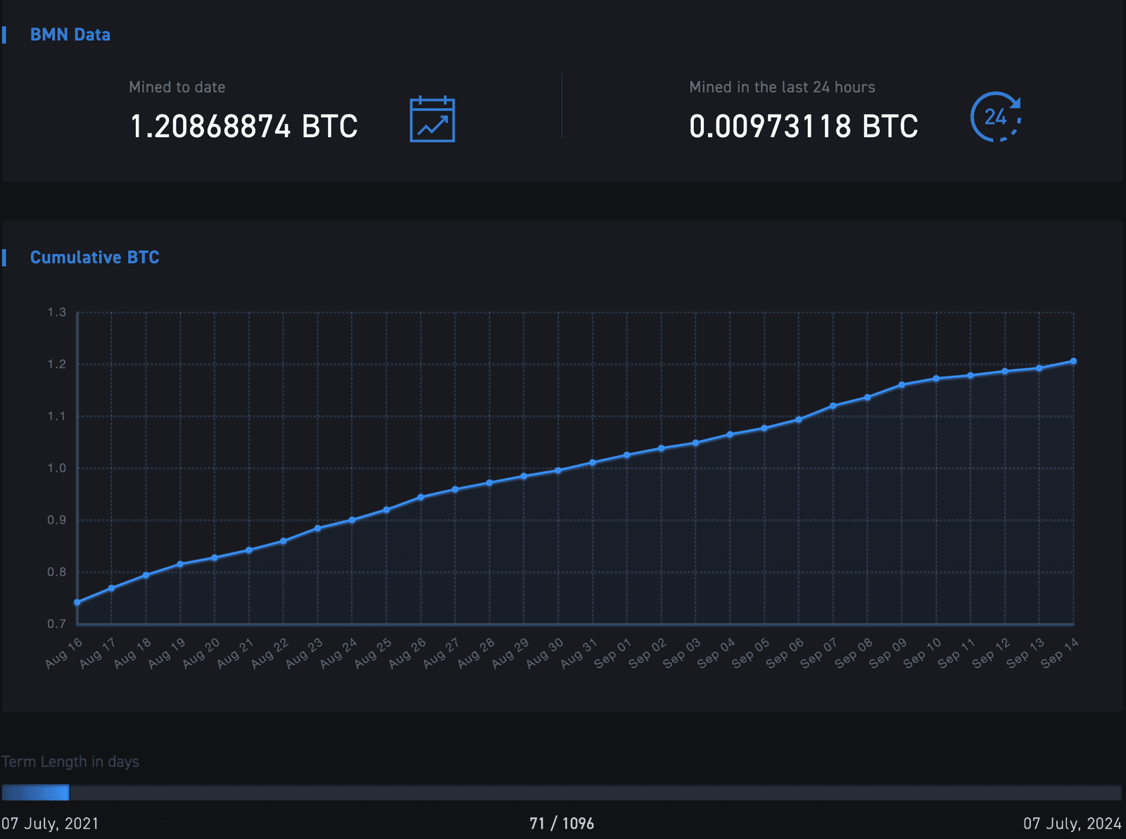 In the 70 days since mining began, each BMN has averaged 0.0171 BTC per day for a total of 1.2 BTC. Mining progress can be tracked here.
