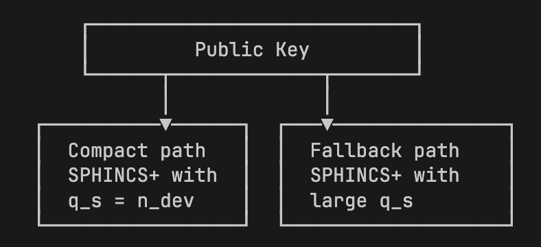 In Bitcoin wallet setups, initializing a device with a seed is typically a manual process that happens rarely. πdev =210 =1024 is conservative; it is hard to imagine importing a single seed into more than a thousand devices. A device that loses its state and re-initializes from the seed will use the compact path again, consuming an additional signature from the compact instanceβs ππ budget.