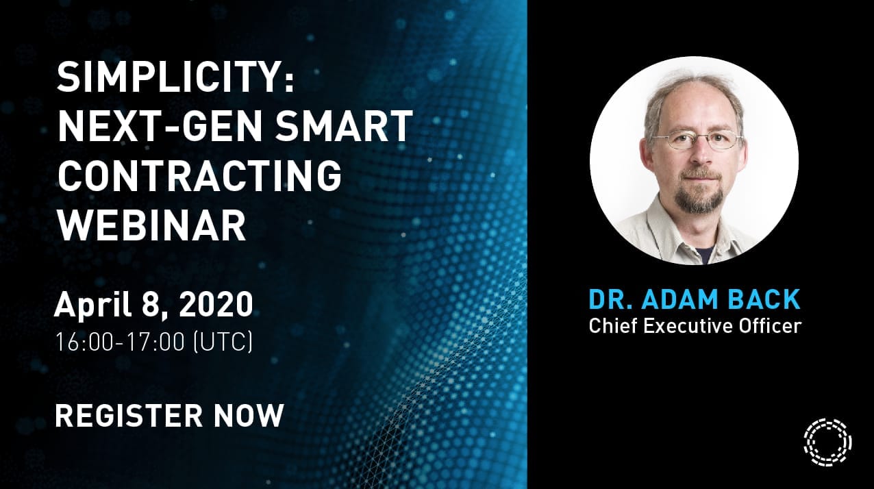 Our CEO, Adam Back, will be presenting a webinar on basics of Simplicity on the 8th of April at 16:00 UTC. It’ll be a great chance for bitcoiners to get their questions answered, so make sure you don’t miss it!